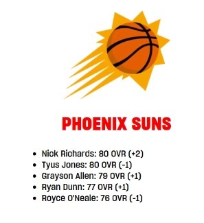 1月31日讯 NBA2K本周更新,太阳队内球员的能力值有所变化,新援理查兹由78上涨至80。
