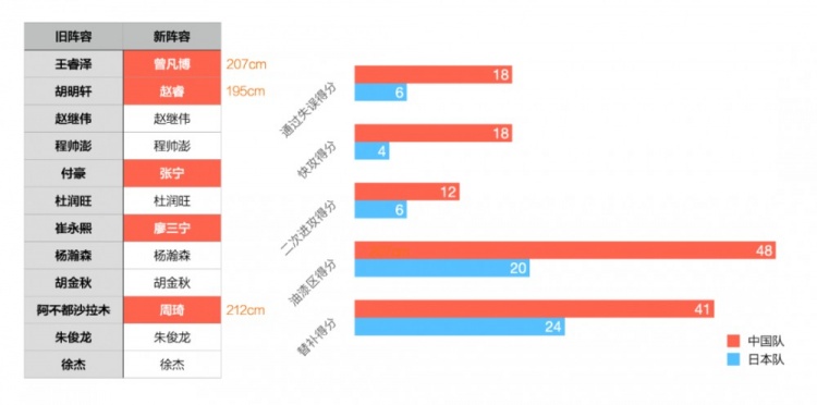 而与上一次亚预赛输给日本队相比,这次我们迎来了赵睿和周琦的回归,并且多了2米07的高大锋线曾凡博。正因为有这些能在对位中占据绝对体型优势的球员加入,我们才有了这次42分的大胜。