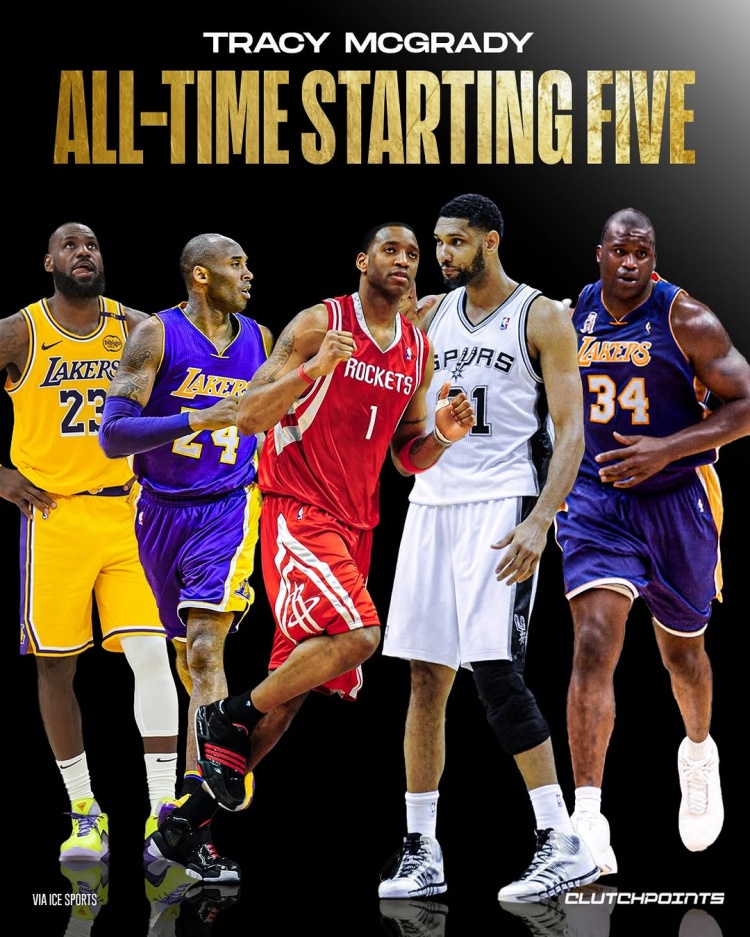 麦迪说道:“我选择勒布朗当控卫,科比得分后卫。我去打三号位,邓肯四号位,奥尼尔五号位。没有不尊重任何人,这就是我的五人组。“