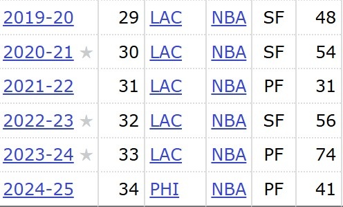 据统计,本赛季乔治出战41场,是他自2021-22赛季以来出战最少的一个赛季,近6年,他已经5次出战不足60场,具体如下: