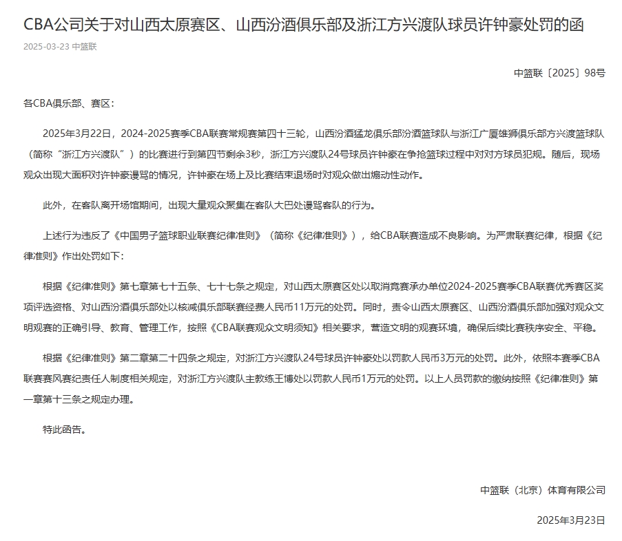 03月23日讯 CBA官方发布公告,许钟豪因煽动观众被罚款3w,王博指导负连带责任被罚款1w;山西赛区因观众聚集围堵客队大巴谩骂客队,被罚款11w,并取消优秀赛区评奖资格。