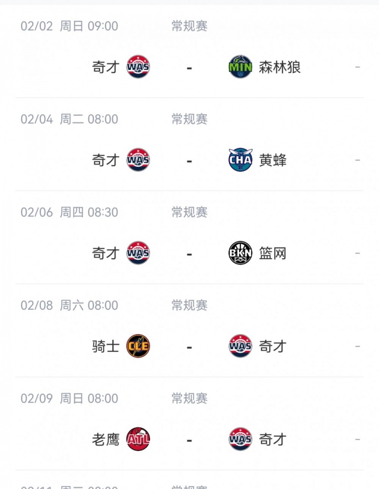 至此,这是奇才本赛季第二次遭遇16连败。而他们接下来的对手如下: