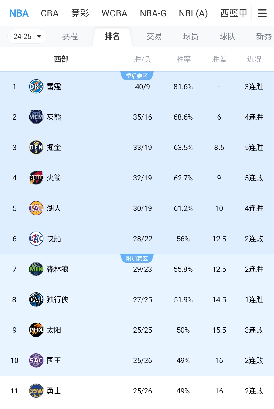 湖人赛季三杀勇士目前30胜19负仍居西部第五名 距火箭仅差1个胜场