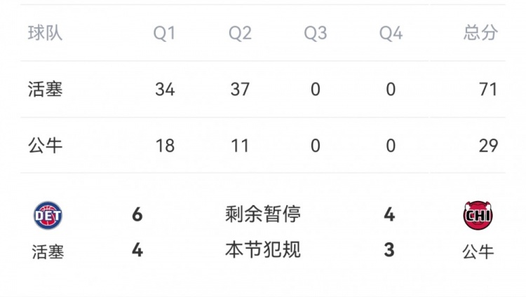 2月12日讯 NBA常规赛,活塞半场71-29领先公牛。