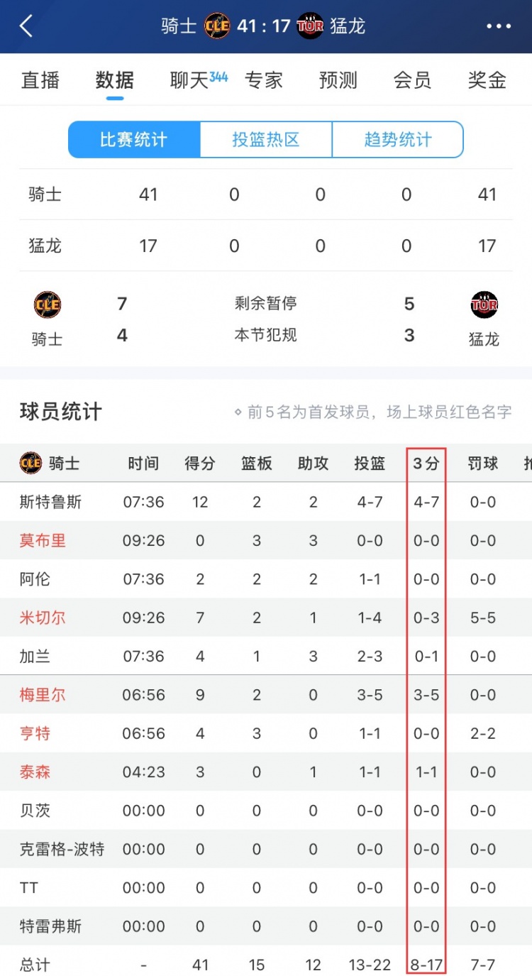 首节比赛,骑士进攻端多点开花,除小莫布里外上场7人皆有得分,合计扔进8记三分,单节轰下41分直接领先到24分!