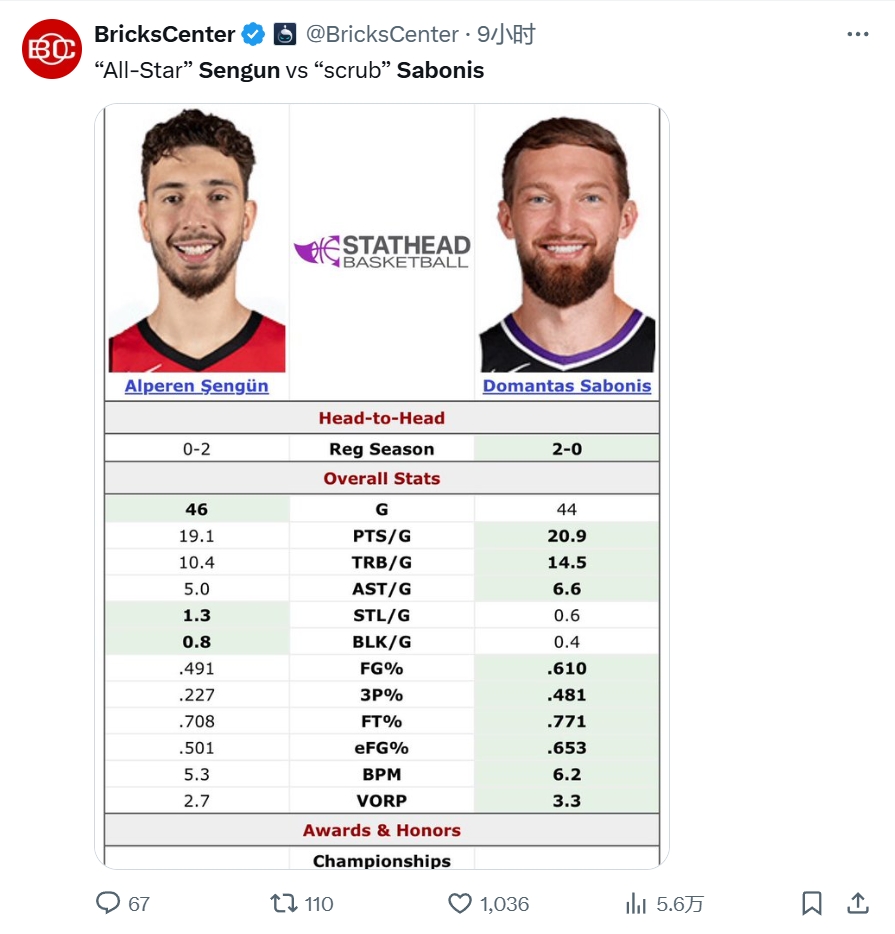 数据全包围!美媒晒图:“全明星”申京VS“被冷落的”小萨 申京场均:19.1分10.4篮板5.0助攻1.3抢断0.8盖帽,命中率49.1%,三分命中率22.7%,罚球70.8%,真实命中率50.1%,BPM5.3,VOPR2.7。小萨场均:20.9分14.5 2025/01/31