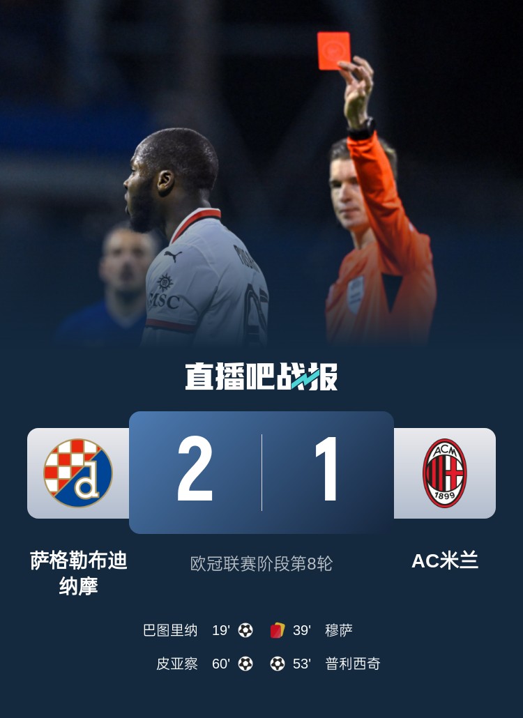 欧冠联赛阶段最后一轮,米兰也是因为红牌葬送好局势。米兰原本取胜可直接晋级16强,但穆萨上半场就两黄被罚下,米兰最终1-2不敌萨格勒布迪纳摩,无缘前八。