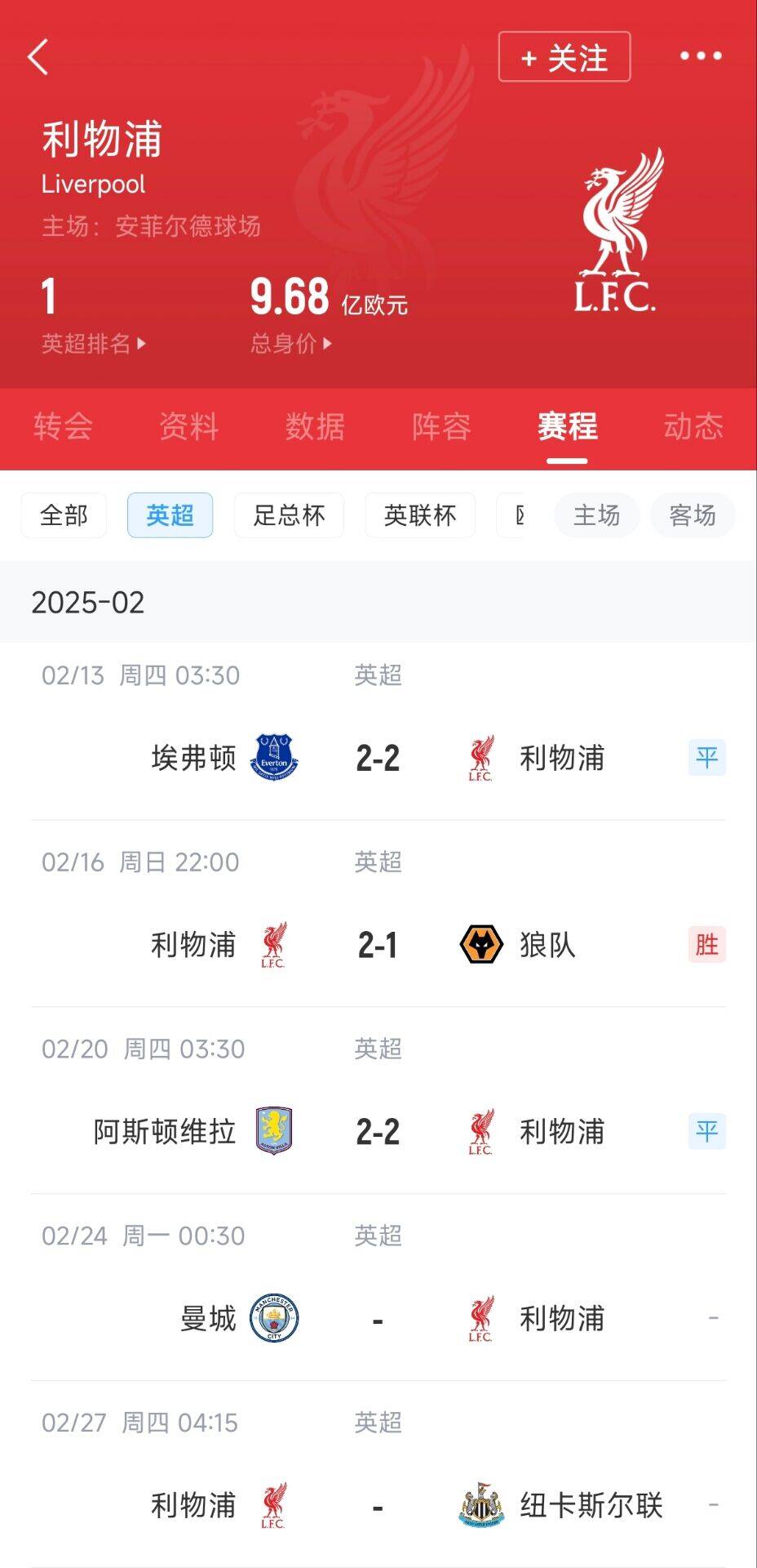 02月20日讯 利物浦在今天凌晨的一场英超比赛2-2战平维拉,现多赛一场8分领跑英超。