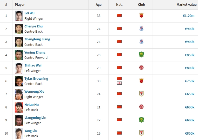 中国籍球员身价排行前十(单位:欧元):