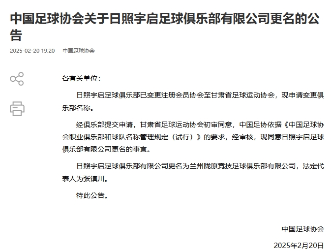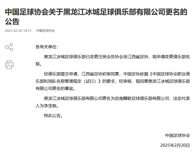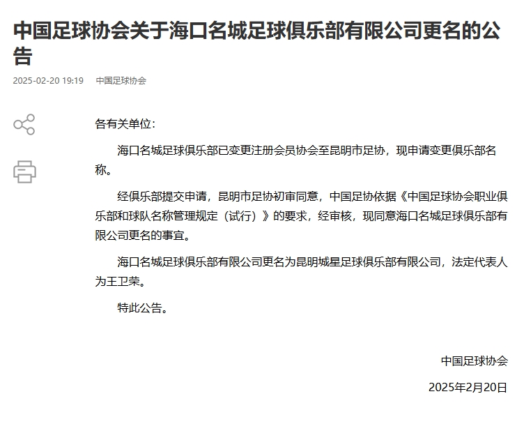 02月20日讯 中国足协官宣5家职业足球俱乐部的更名事宜,此前这5家俱乐部已经变更注册会员协会,也就是俗称的“异地搬迁”。