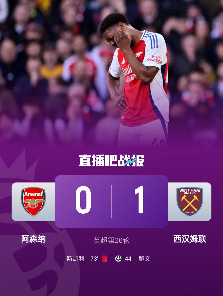 英超联赛第26轮,阿森纳主场0-1不敌西汉姆,鲍文进球,斯凯利红牌。
