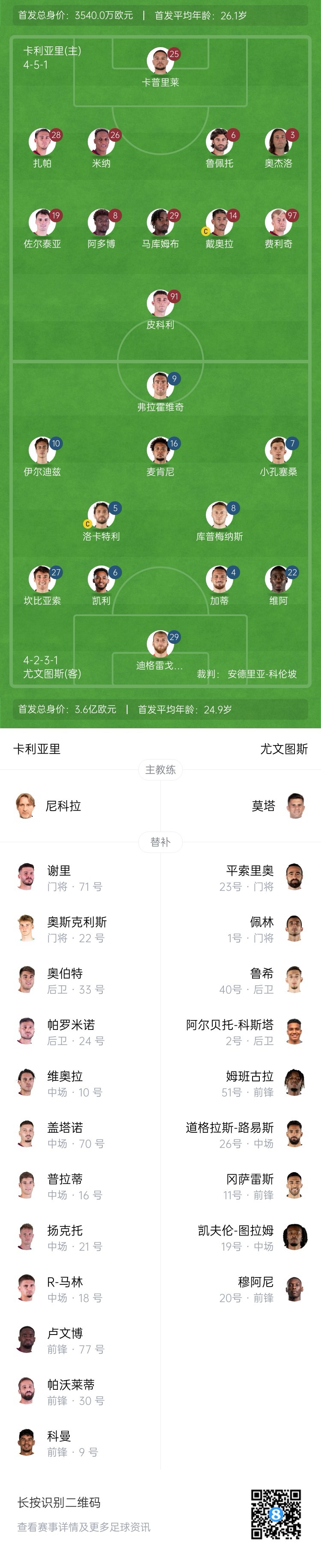 卡利亚里替补:71-谢里、22-奥斯克利斯、33-奥伯特、24-帕罗米诺、10-维奥拉、70-盖塔诺、16-普拉蒂、21-扬克托、18-R-马林、77-卢文博、30-帕沃莱蒂、9-科曼