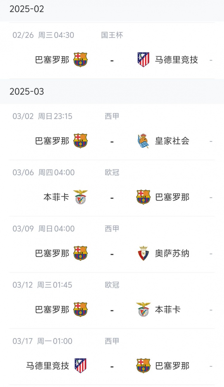2月24日讯 未来三周,巴萨、皇马和马竞将迎来一系列关键赛事。《每日体育报》报道,巴萨的赛程相对较为有利,六场比赛中将有四场主场作战。