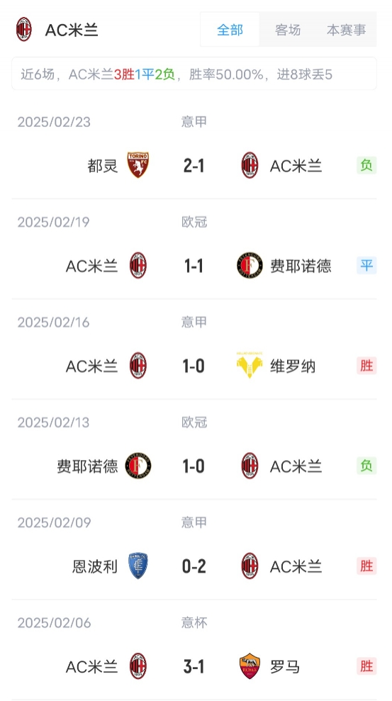 目前意甲25轮比赛过后,AC米兰11胜8平6负积41分,位列意甲第7位。博洛尼亚10胜11平4负积41分,位列第8。