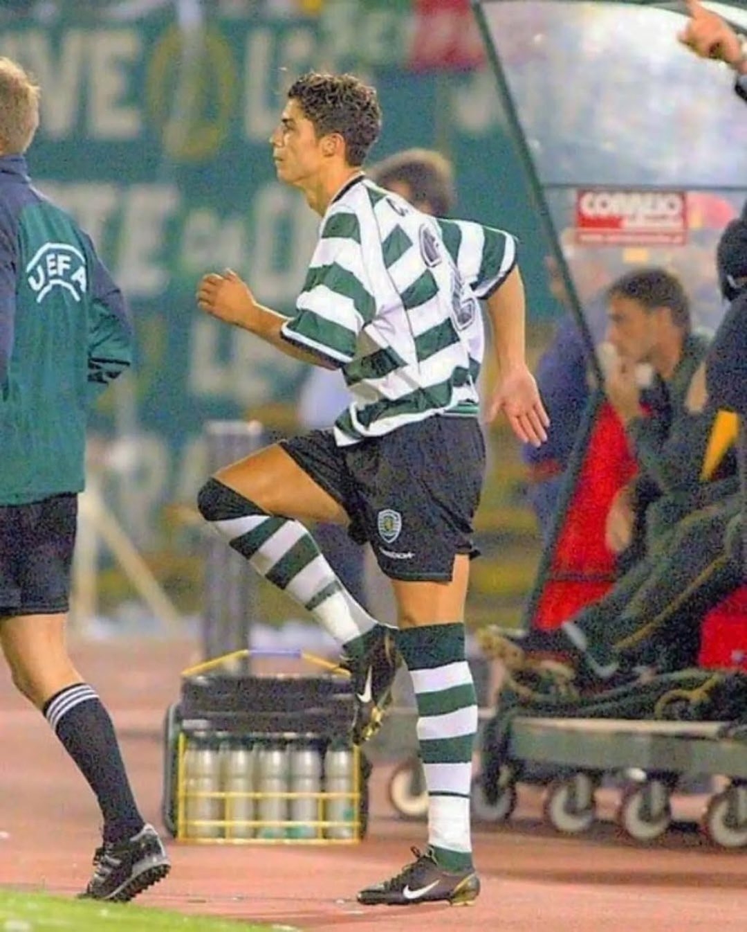 2002年8月14日,C罗代表葡萄牙体育在欧冠资格赛中登场,上演了职业生涯首秀,当时他穿着的就是刺客一代“Dark Cinder”。