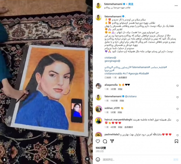 外媒:伊朗一画家希望向C罗赠送礼物,她为乔治娜准备了画作