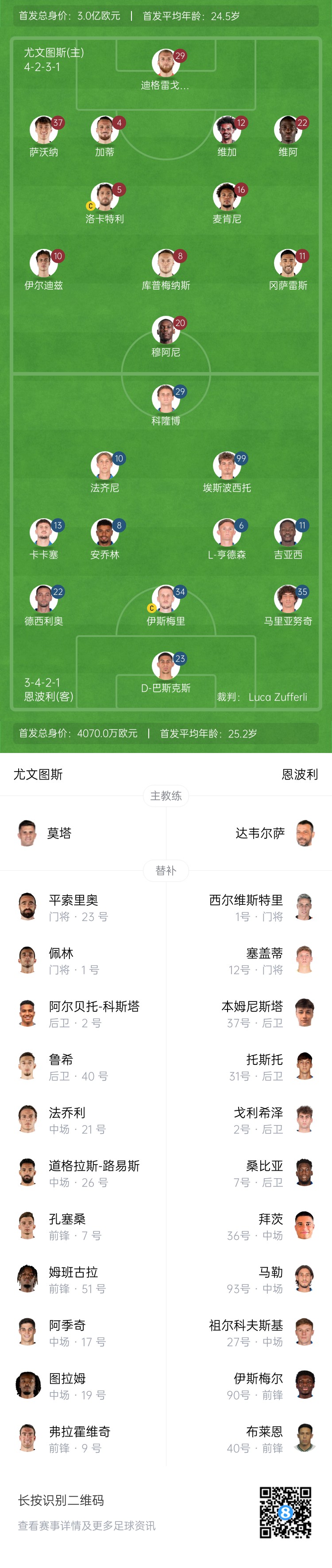 尤文首发:29-迪格雷戈里奥、4-加蒂、37-萨沃纳、12-维加、5-洛卡特利、8-库普梅纳斯、11-尼古拉斯-冈萨雷斯、16-麦肯尼、22-维阿、10-伊尔迪兹、20-穆阿尼