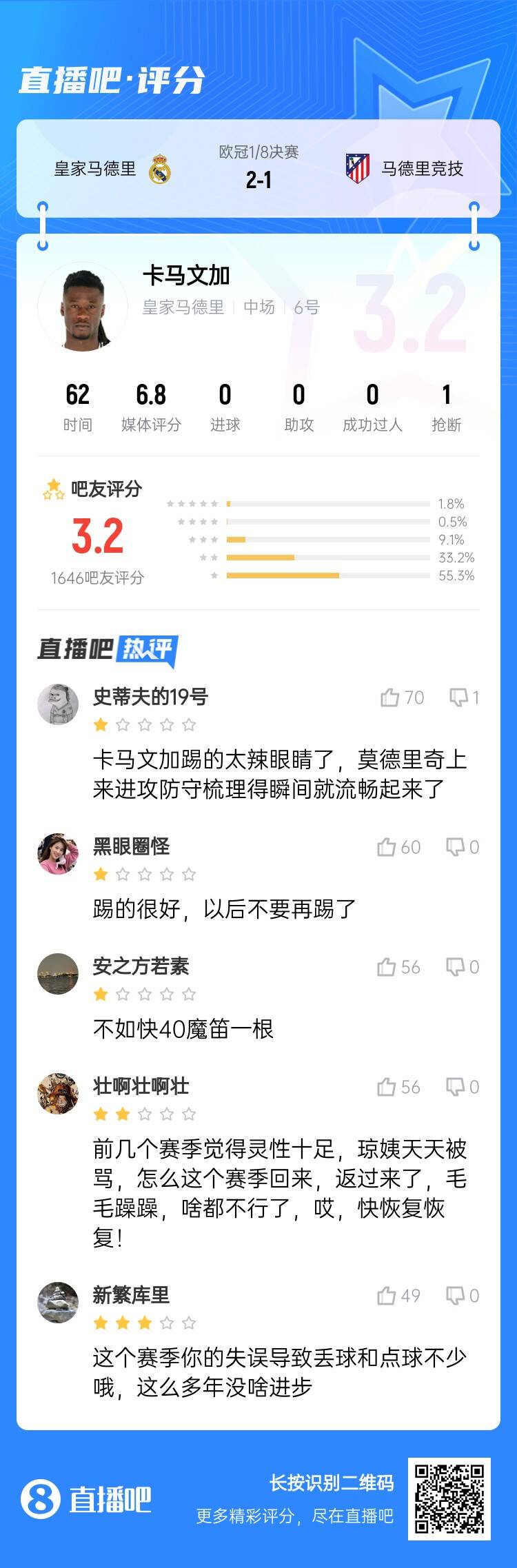 03月05日讯 欧冠1/8决赛首回合,皇马2-1战胜马竞,22岁的皇马中场卡马文加本场首发出战62分钟,表现不佳遭球迷痛批。