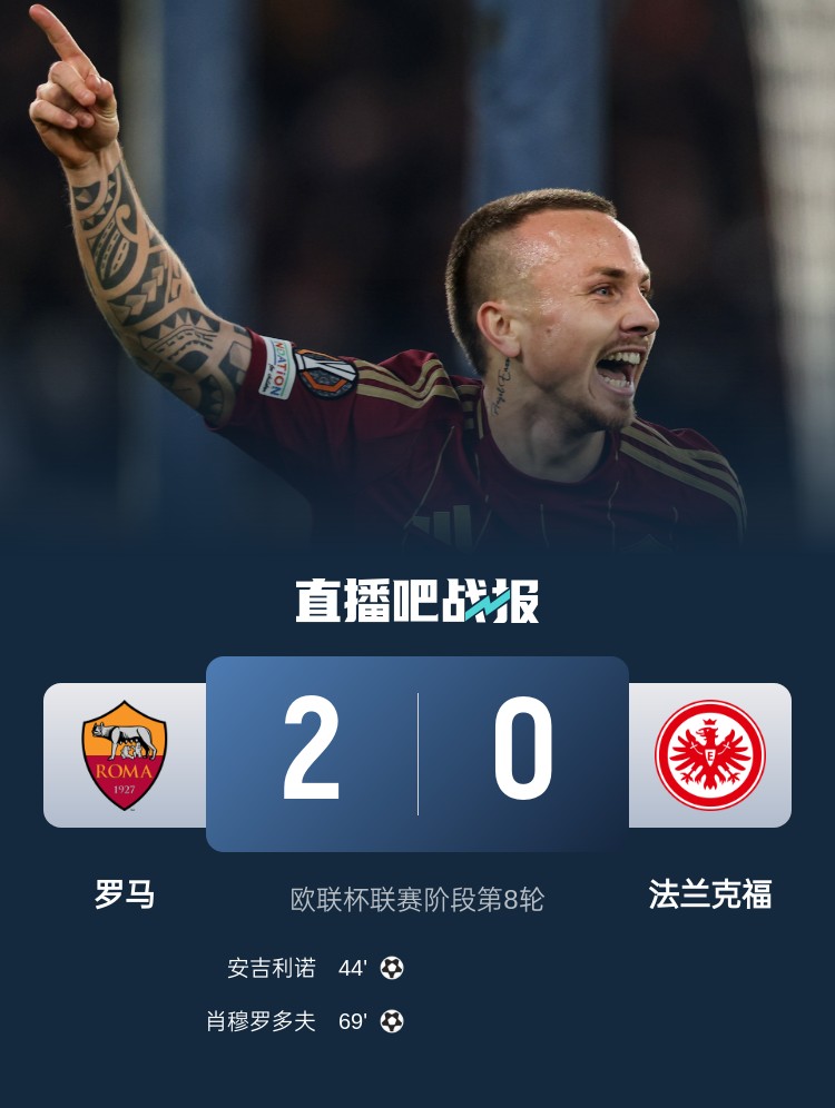 安吉利诺、肖穆罗多夫破门,罗马2-0击败法兰克福,进入欧联淘汰赛附加赛。