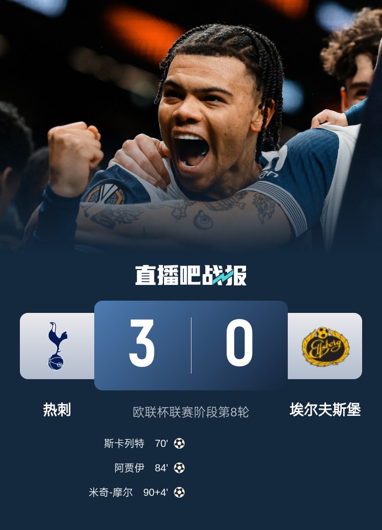 热刺3-0埃尔夫斯堡,排名第四直接晋级16强。