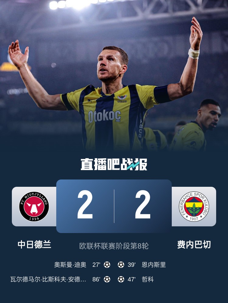恩内斯里、哲科破门,费内巴切2-2中日德兰,排名第24获得附加赛资格。