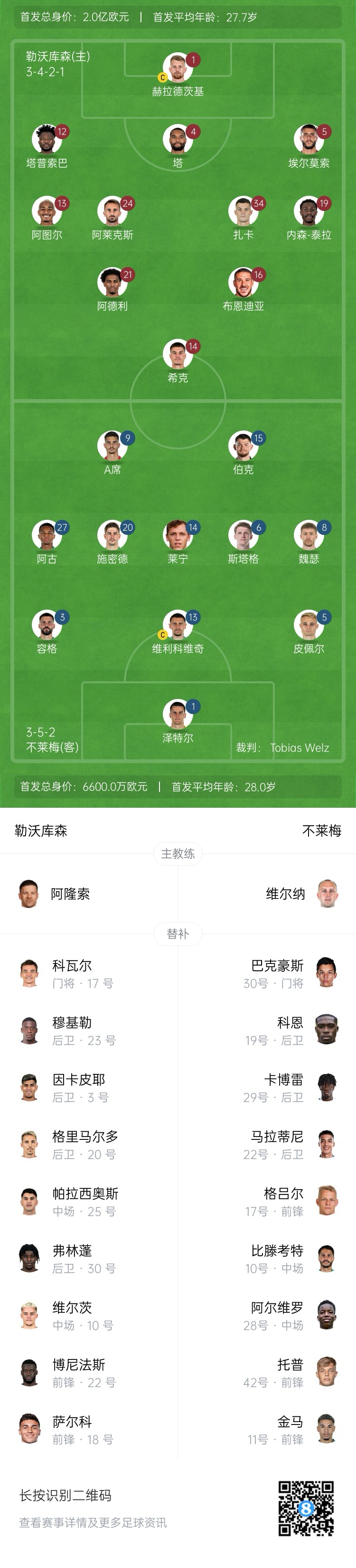 勒沃库森首发:1-赫拉德茨基、4-若纳坦-塔、5-埃尔莫索、12-塔普索巴、13-阿图尔、24-阿莱克斯-加西亚、16-布恩迪亚、34-扎卡、14-希克、19-内森-泰拉、21-阿德利