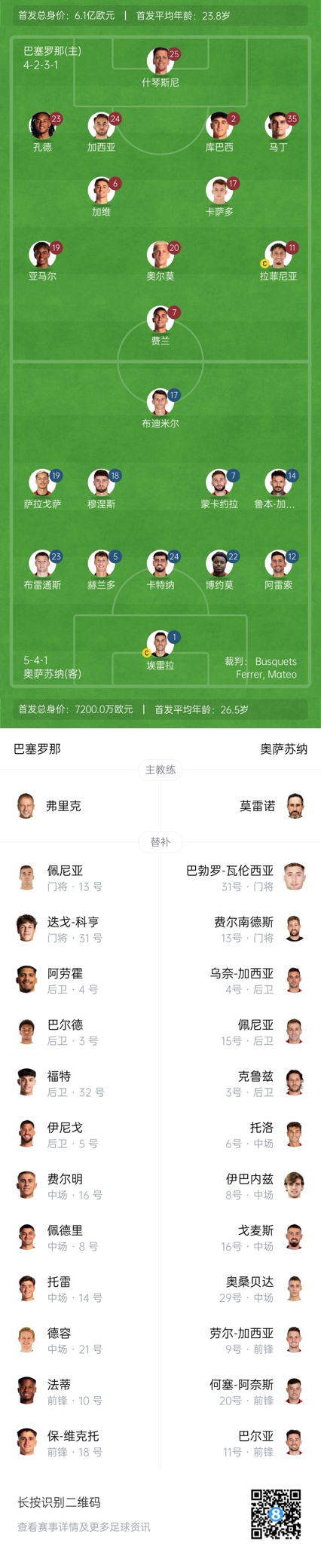 巴萨首发:25-什琴斯尼、24-埃里克-加西亚、2-库巴西、35-杰拉德-马丁、23-孔德、6-加维、17-卡萨多、11-拉菲尼亚、19-亚马尔、20-奥尔莫、7-费兰