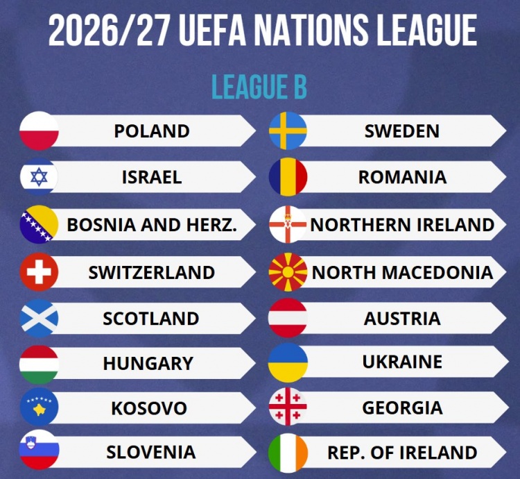 欧国联2026-27赛季B级别球队出炉:苏格兰、乌克兰、波兰在列