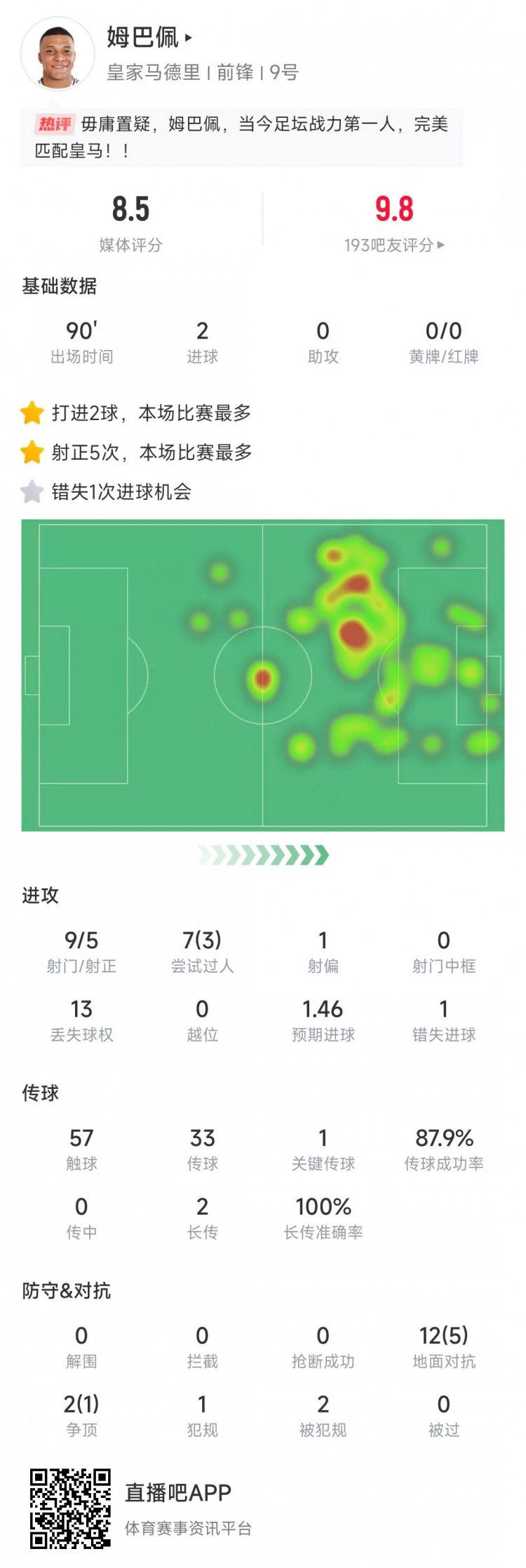 姆巴佩当选全场最佳球员:9次射门打进2球,7次过人3次成功