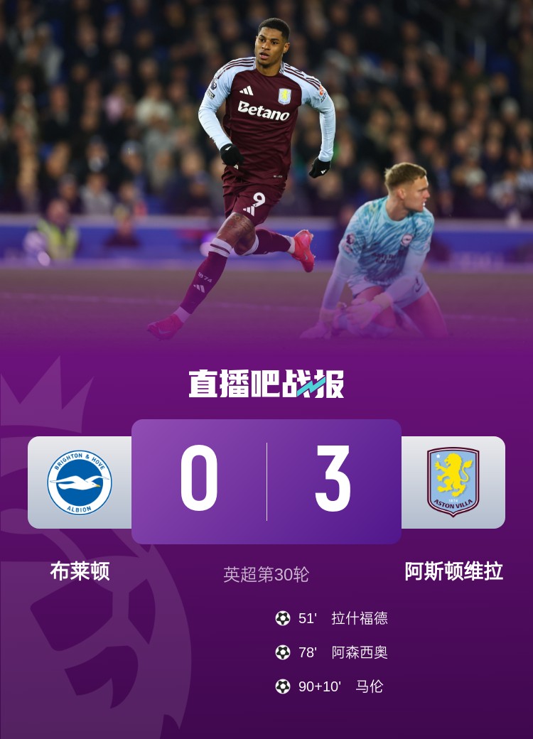 拉什福德、阿森西奥、马伦破门,维拉3-0布莱顿各赛事六连胜。