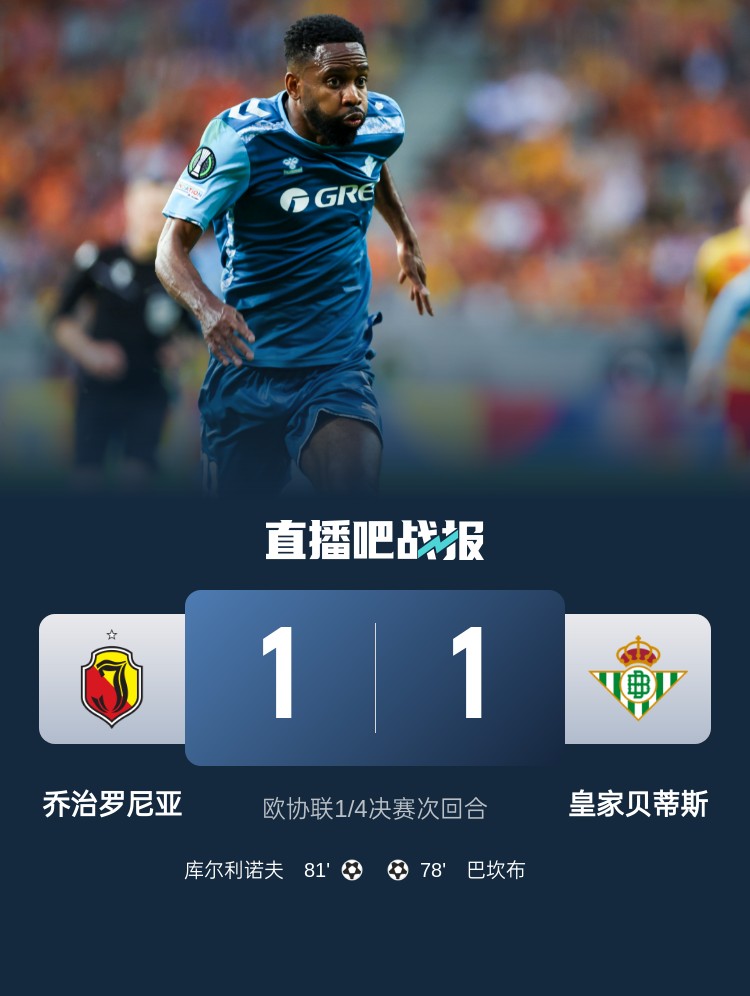巴坎布破门,贝蒂斯1-1战平乔治罗尼亚,两回合总比分3-1淘汰对手!半决赛将迎战佛罗伦萨。