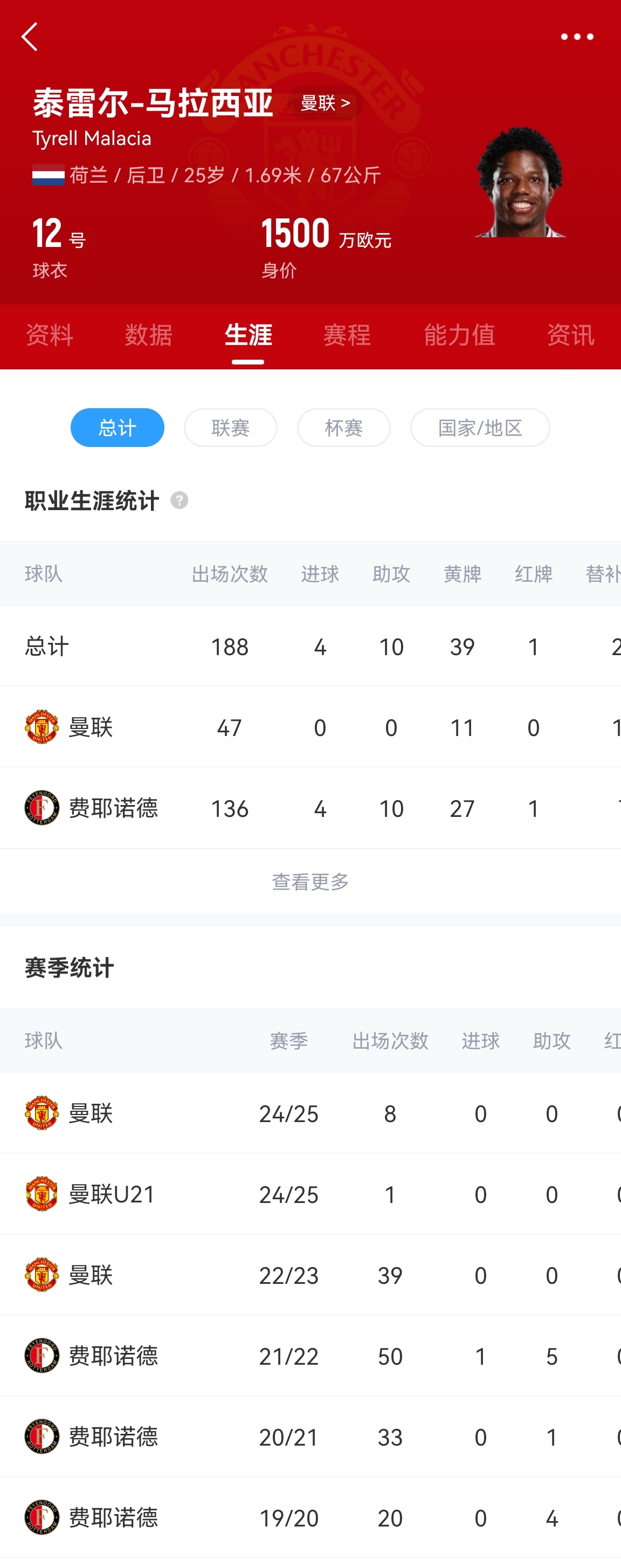 马拉西亚是滕哈赫执教期间1500万欧元从费耶诺德签下的,但加盟以后受伤病和适应问题的困扰,2年半总共只为曼联出场47次。