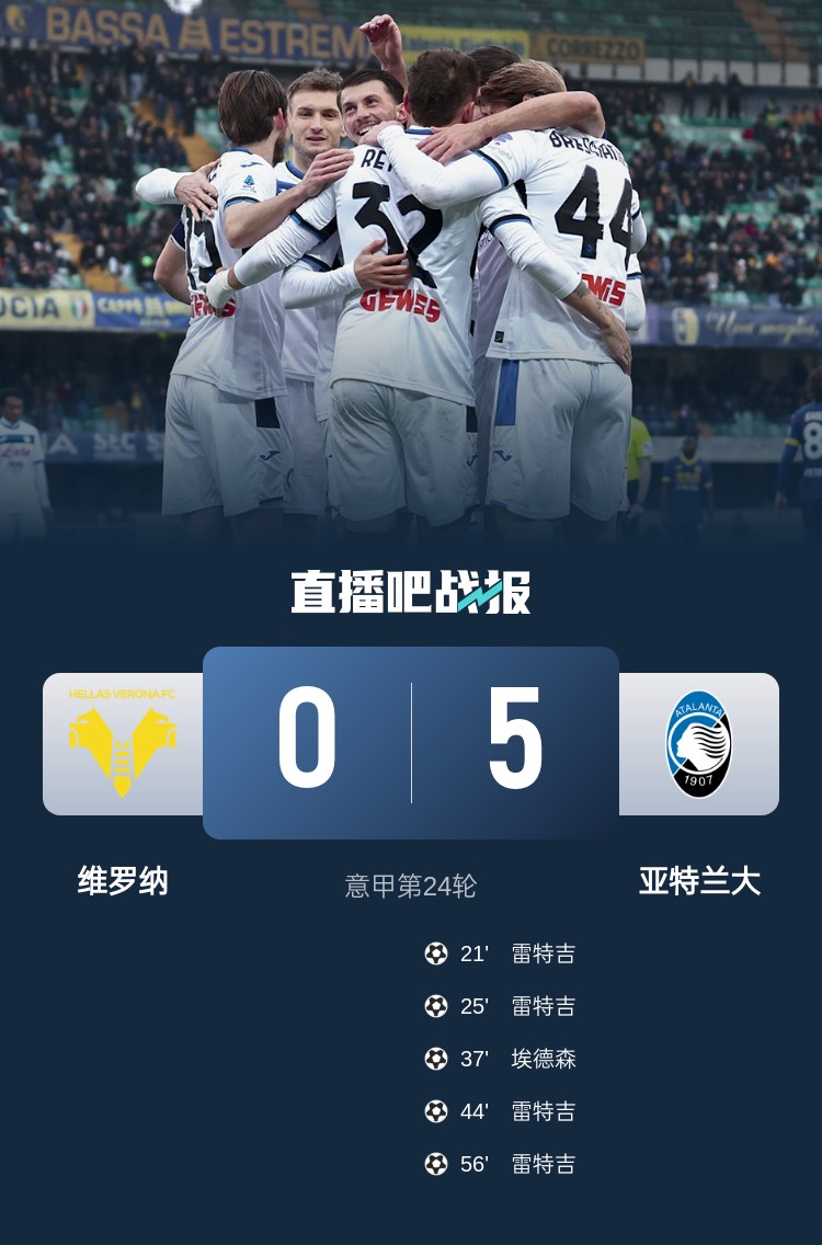 亚特兰大本轮5-0横扫维罗纳,雷特吉大四喜成为本场绝对明星。
