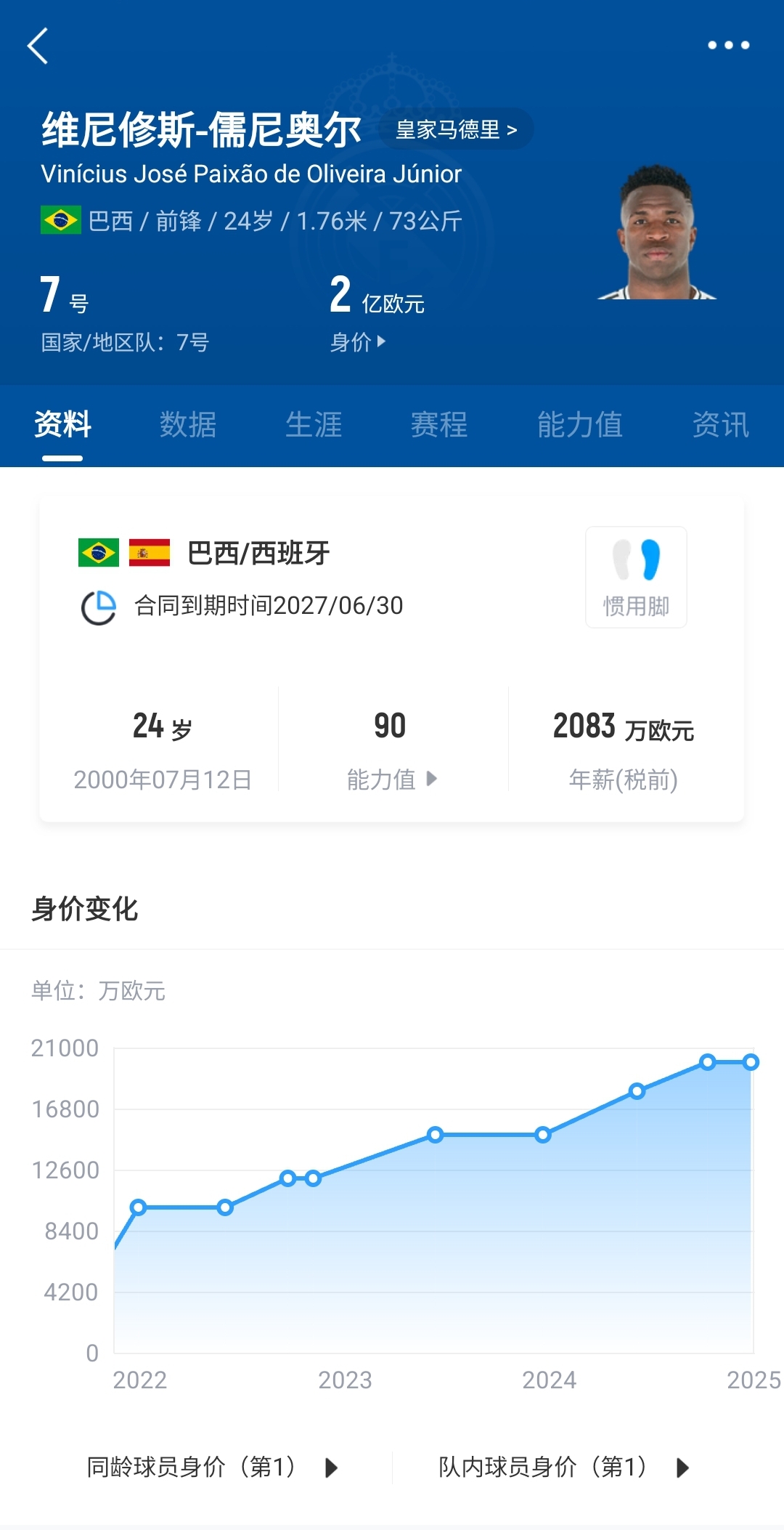 本赛季24岁的维尼修斯为皇马出战30场比赛,贡献16球11助,目前球员德转身价2亿欧。