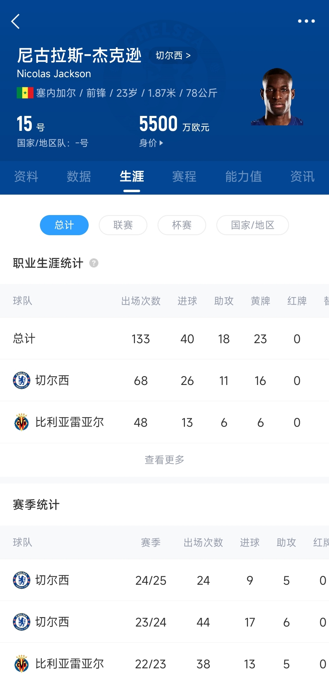 23岁的塞内加尔前锋杰克逊,本赛季代表切尔西出战24场比赛,贡献9球5助。目前切尔西英超24轮积43分,排名联赛积分榜第4,落后第三名诺丁汉森林4分。