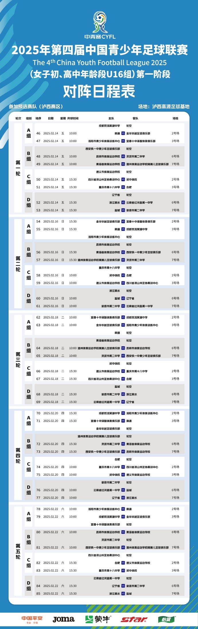 中国青少年足球联赛(女子初高中年龄段U16组)第一阶段竞赛日程