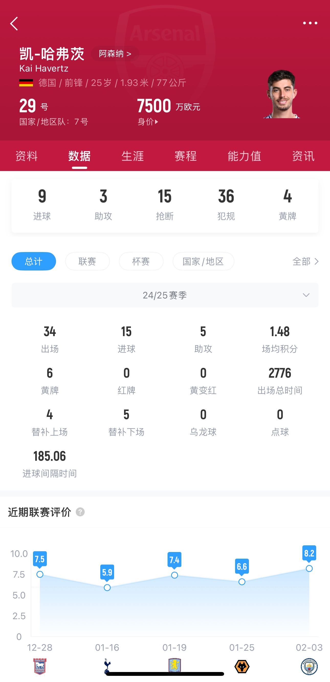 25岁的德国前锋哈弗茨,本赛季代表阿森纳出战34场比赛,贡献15粒进球和5次助攻。目前阿森纳排名英超第2,落后榜首利物浦7分;欧冠联赛阶段阿森纳排名第3,已经直通淘汰赛16强。