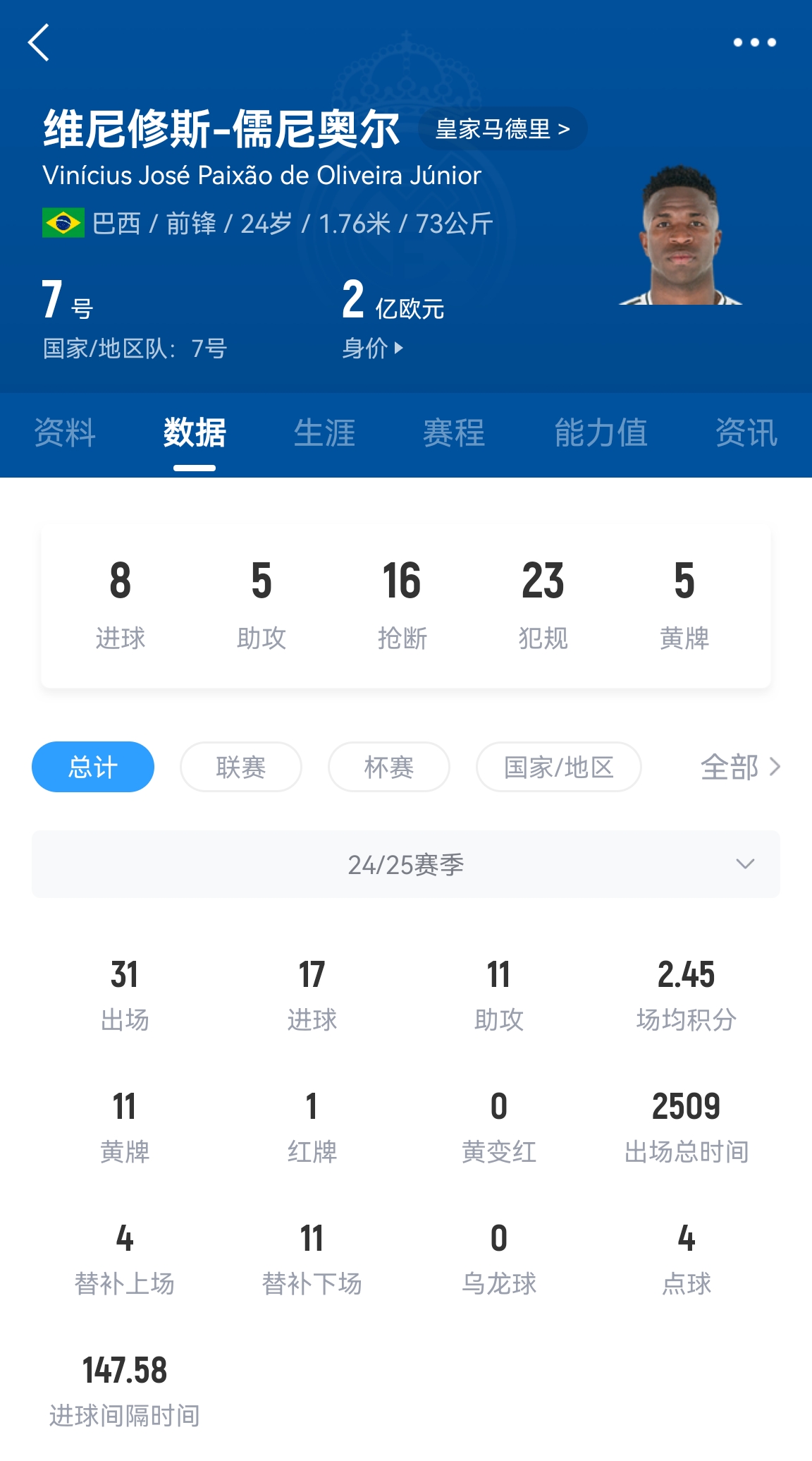 2月12日,维尼修斯在逆转曼城赛后采访称不知道沙特报价,希望留在皇马很长时间。