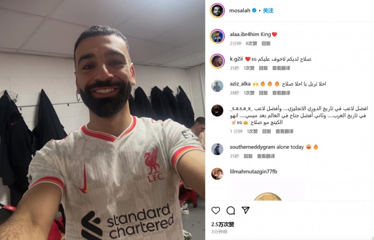 这次不合影了!萨拉赫赛后社媒晒在更衣室开心自拍照 2月2日讯 利物浦在本轮英超2-0力克伯恩茅斯,梅开二度的萨拉赫堪称最大功臣。萨拉赫先是在上半场点射破门,又在下半场通过个人能力撩射建功。他也赛后通过社媒晒出自己在更衣室的自拍照纪念胜利。值得一提的是 2025/02/02