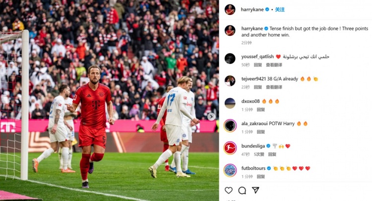 凯恩社媒纪念胜利:最后时刻有些紧张,但还是赢了! 2月2日讯 拜仁在本轮德甲4-3险胜基尔,凯恩在本场比赛梅开二度。他也在赛后通过社媒晒出自己进球后的庆祝照,并配文:“最后时刻有些紧张,但我们还是完成了任务。3分到手,又一场主场胜利。”凯恩在本场比赛 2025/02/02