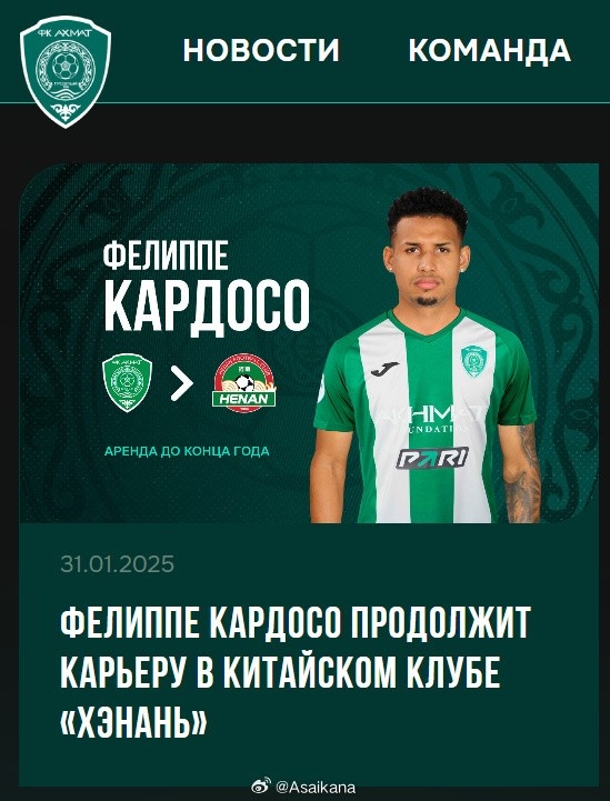 格罗兹尼艾哈迈德官方宣布费利佩-卡多佐租借加盟中超河南队 俄罗斯超级联赛球队格罗兹尼艾哈迈德(Akhmat Grozny)官方宣布,该队巴西球员费利佩·卡多佐(Felippe Cardoso)租借加盟中超河南队。费利佩·卡多佐今年26岁,司职中锋。2023年 2025/02/01
