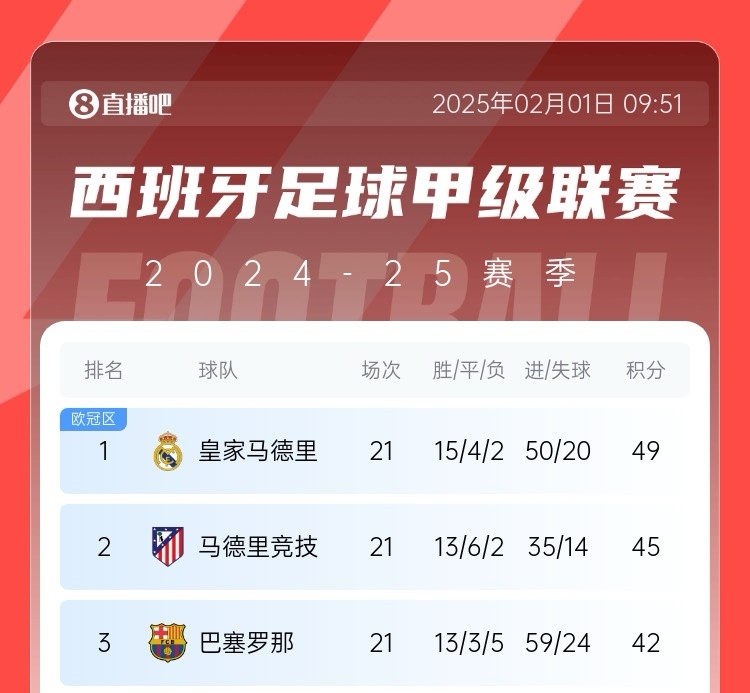 西甲争冠生变?皇马2月多两场欧冠&与曼城决战,巴萨马竞以逸待劳 02月01日讯 皇马在欧冠淘汰赛附加赛遭遇曼城,两个冠军热门将为进入16强展开决战。皇马与曼城的两回合比赛将在2月12日和2月20日4点开打,而首回合正是马德里德比后3天。皇马2月面临赛程考验,由于巴 2025/02/01