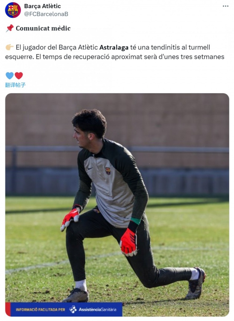 巴萨官方:阿斯特拉拉加遭遇左脚踝肌腱炎,预计缺席三周左右 2月1日讯 巴萨官方确认,阿斯特拉拉加遭遇脚踝肌腱炎,预计缺席三周左右。巴萨官方发布医疗公告,确认20岁门将阿斯特拉拉加左脚踝患有肌腱炎,大约需要三周的时间来恢复。阿斯特拉拉加本赛季为巴萨竞技(B队) 2025/02/01