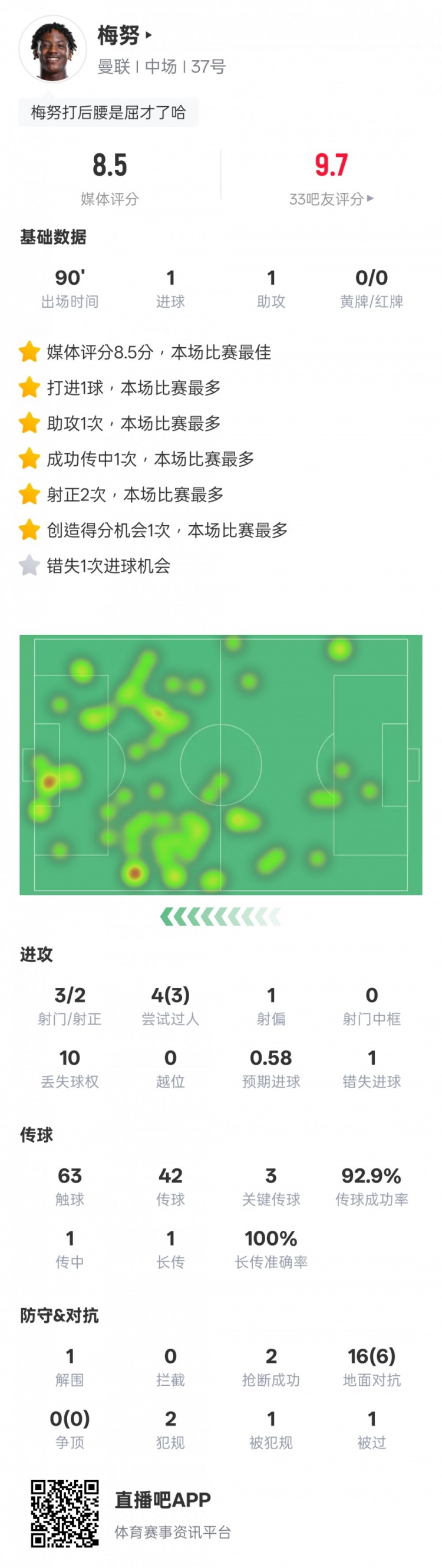 梅努本场数据:传射建功+3关键传球3过人成功,评分8.5全场最高 1月31日讯 欧联杯联赛阶段第8轮,曼联2-0战胜布加勒斯特星,直通16强。本场比赛梅努首发出战,传射建功,还有3次关键传球,3次过人成功,评分8.5全场最高。梅努本场比赛数据如下:进球1助攻1射门3 2025/01/31