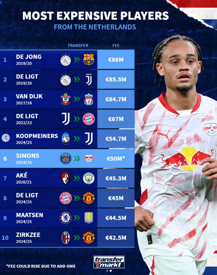 荷兰球员转会费榜:德容居首,西蒙斯在列,德里赫特三度上榜 1月31日讯 哈维-西蒙斯正式从巴黎转会莱比锡,固定转会费5000万欧,另外还有3000万欧浮动奖金。德转盘点了荷兰球员历史转会费榜,具体如下(只统计固定转会费):1、德容(阿贾克斯→巴萨)8600万 2025/01/31